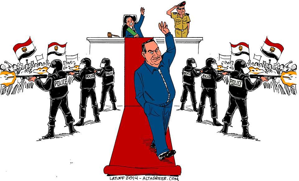¿Te sorprende que el presidente depuesto, Hosni Mubarak, y que su ministro del Interior y sus ayudantes hayan sido declarados inocentes? Pues lee la sentencia de la exculpación para que sepas que no hay nada de sorprendente. La sentencia no solo exculpa a Mubarak y a su entorno, sino que acusa a la revolución del 25 de enero y a todos los que participaron en ella y la apoyaron. La sentencia acusa al eje del mal formado por EE. UU., Israel, Irán, Turquía y Qatar de movilizar y apoyar a quienes participaron en esa revolución (…). Esta gente quiere que nos creamos sus mentiras y que dejemos de creer a nuestros ojos, que vieron cómo la policía de Mubarak y Habib al Adli abría fuego contra los manifestantes y los atropellaba con los vehículos de la Seguridad Central. Lo que quieren es que olvidemos las imágenes de los mártires abatidos por las balas de la policía en todas las partes del país. No olvidaremos y contaremos a nuestros hijos sus crímenes, aunque dicten mil sentencias de exculpación.